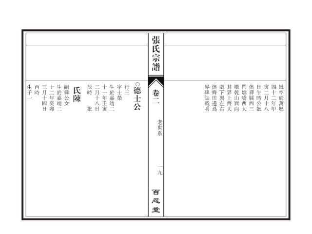 张氏宗谱 生子一 酉時 三月十四日 十二年癸卯 生於嘉靖二 嗣舜公女 氏陳 辰時 二月十八日 十一年壬寅 生於嘉靖二 字士榮 行三 德士公 界碑誌載明 俱齊田邊爲 墩下與左右 其界上齊大 墩乾山巽向 門壋嘺西大 俱葬縣西三 日午時公妣 寅二月十八 四十二年甲 妣卒於萬厯 卷二 妣 老世系 一九 百忍堂