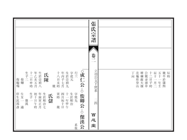 张氏宗谱 卷二 立功公支下世系 生子二 十二日申時 年乙亥五月 生於崇禎八 氏陳 十八日亥時 年丙子七月 生於崇禎九 字從元 行三 成仁公 丁向 北龜形癸山 塘廟南大堰 公妣並葬草 十二日子時 辰十一月二 五十一年壬 妣卒於康熙 辰時 俊翰殤 俊卿 妣 庠生沈邦彥 生女一 生子一 初十日午時 年庚寅正月 生於順治七 氏儲 寅時 四月初十日 十一年甲午 生於順治 字效先 俊卿公 傑漢 二四 適 妣 百忍堂 傑漢公 系後