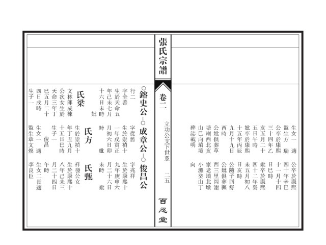監生章文煥 生女一 俊昌 生子一 十五日巳時 年丁丑九月 生於崇禎十 氏方 時 月初六日卯 一年戊寅正 生於崇禎十 字從舊 成章公 碑誌載明 山巳向墳境 塘廟西北亥 公妣俱葬草 酉時 九月十九日 十五年丙辰 妣卒於康熙 五日午時 亥五月二十 三十四年乙 公卒於康熙 監生方 生女一