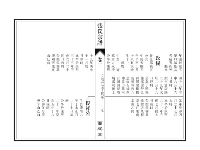山巳向 塘廟西北亥 公妣俱葬草 四日酉時 戌六月二十 三十三年甲 妣卒於康熙 日申時 十一月初一 十九年庚申 公卒於康熙 縣丞方永清 生女一 生子一 十八日辰時 年辛酉正月 生於天啟元 公女 登仕郎植五 氏楊 舌凌遲而死 絕口賊斷其 年遇賊罵不