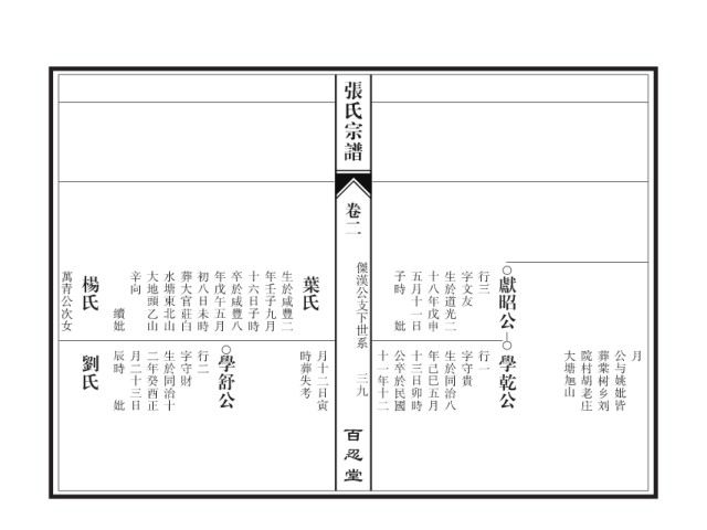张氏宗谱 卷二 傑漢公支下世系 萬青公次女 楊氏 辛向 大地頭乙山 水塘東北山 葬大官莊白 初八日未時 年戊午五月 卒於咸豐八 十六日子時 年壬子九月 生於咸豐二 葉氏 子時 五月十一日 十八年戊申 生於道光二 字文友 行三 獻昭公 續妣 妣 劉氏 辰時 月二十三日 二年癸酉正 生於同治十 字守財 行二 學舒公 時葬失考 月十二日寅 十一年十二 公卒於民國 十三日卯時 年己巳五月 生於同治八 字守貴 行一 學乾公 大塘 院村胡老庄 葬棠树乡刘 公与姚妣皆 月 三九 山 妣 百忍堂
