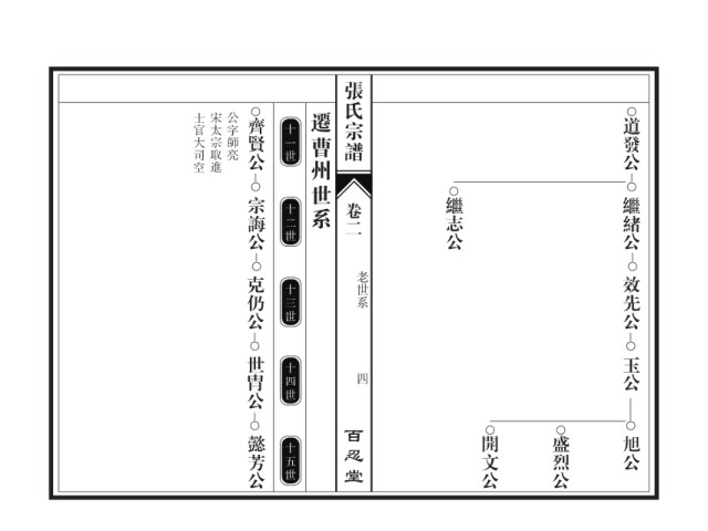 张氏宗谱 士官大司空 宋太宗取進 公字師亮 齊賢公 遷曹州世系 道發公 十一世 宗誨公 繼志公 繼緒公 十二世 卷二 克仍公 老世系 效先公 十三世 世胄公 玉公 十四世 四 百忍堂 懿芳公 開文公 盛烈公 旭公 十五世