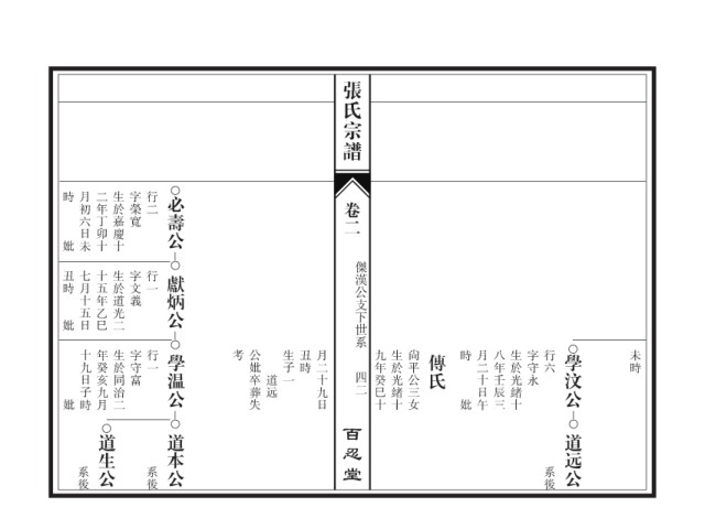张氏宗谱 時 月初六日未 二年丁卯十 生於嘉慶十 字榮寬 行二 必壽公 卷二 妣 傑漢公支下世系 丑時 七月十五日 十五年乙巳 生於道光二 字文義 行一 獻炳公 妣 十九日子時 年癸亥九月 生於同治二 字守富 行一 學温公 考 公妣卒葬失 生子一 丑時 月二十九日 九年癸巳十 生於光緒十 尙平公三女 傳氏 時 月二十日午 八年壬辰三 生於光緒十 字守永 行六 學汶公 未時 道远 四二 妣 妣 百忍堂 道生公 道本公 道远公 系後 系後 系後