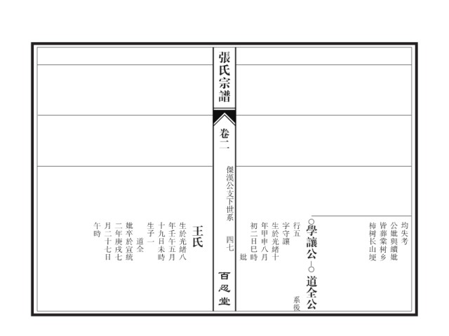 张氏宗谱 卷二 傑漢公支下世系 午時 月二十七日 二年庚戌七 妣卒於宣統 生子一 十九日未時 年壬午五月 生於光緒八 王氏 初二日巳時 年甲申八月 生於光緒十 字守讓 行五 學讓公 柿树长山埂 皆葬棠树乡 公妣與續妣 均失考 四七 道全 妣 百忍堂 道全公 系後