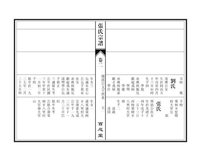 二十五日卯 二七年二月 妣卒於一九 子時 一月初二日 三年甲寅十 公卒於民國 三適嫁失考 子裕正 談明學公長 獻超爲女適 承祧與胞兄 次女 公長子眞有 長適朱忠心 生女三 學仕 獻才爲嗣 承祧與胞弟 學明 獻超爲嗣 承祧與胞兄 生子四 十三日辰時 年丙寅四月 生於同治五 茂堆公女 劉氏 丑時