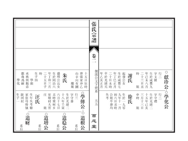 獻珠爲嗣 承祧與胞弟 生子四 時 二十五日子 年丁卯三月 生於同治六 盛明公長女 朱氏 山辛向有圖 葬張家冲乙 十五日辰時 年乙亥正月 卒於光緒元 二十日未時 年丁巳正月 生於咸豐七 起發公女 謝氏 時 二十三日丑 年己未八月 生於咸豐九 字文隆 行二 獻珍公