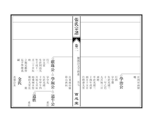 张氏宗谱 卷二 傑漢公支下世系 嗣 長子學颜爲 立胞兄獻珍 時 月二十日辰 年壬戌十一 生於同治元 字文富 行三 獻珠公 名榮公女 金氏 墩村大官庄 時棠树乡窑 月初七日辰 十年甲午四 生於光緒二 字守先 學颜公 卯山酉向 庄東南山陂 巳時葬大官 四月十五日 十四年戊申 卒於光緒三 酉時 九月初三日 十一年乙巳 生於光緒三 字守豐 行四 學治公 嘴 庄河对面钟 五七 妣 百忍堂 道胜 道牛公 系后 系后