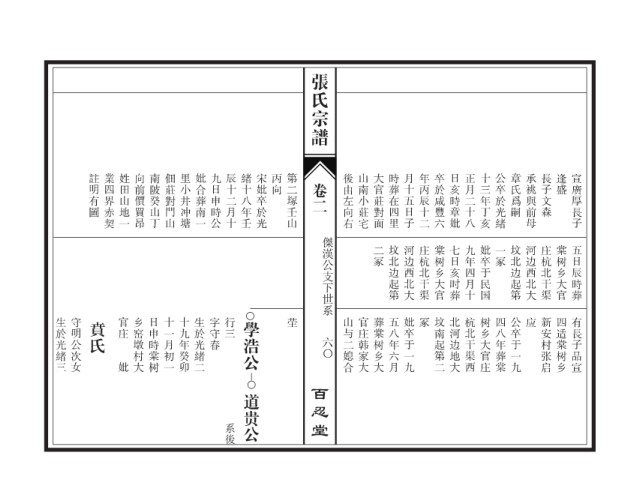 生於光緒三 守明公次女 賁氏 官庄 乡窑墩村大 日申時棠树 十一月初一 十九年癸卯 生於光緒二 字守春 行三 學浩公 茔 山与二媳合 官庄韩家大 葬棠树乡大 五八年六月 妣卒于一九 冢 坟南起第二 北河边地大 杭北干渠西 树乡大官庄 四八年葬棠 公卒于一九 应 新安村张启 四适棠树乡 有長子品宣