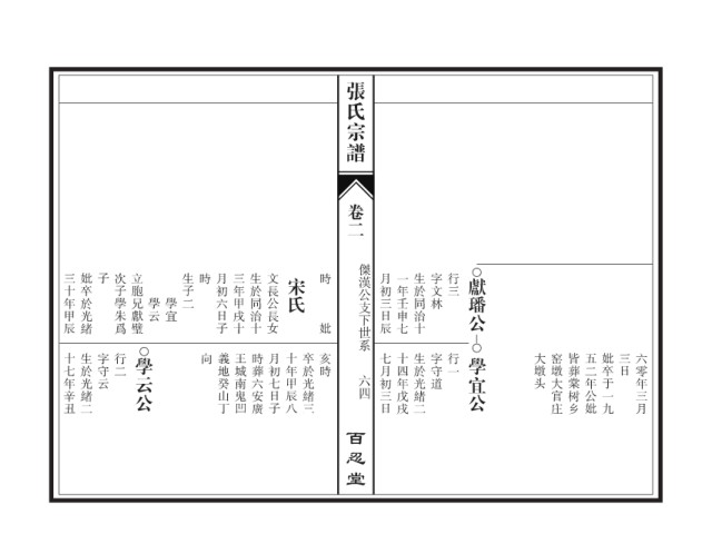 三十年甲辰 妣卒於光緒 子 次子學朱爲 立胞兄獻璧 生子二 時 月初六日子 三年甲戌十 生於同治十 文長公長女 宋氏 時 月初三日辰 一年壬申七 生於同治十 字文林 行三 獻璠公