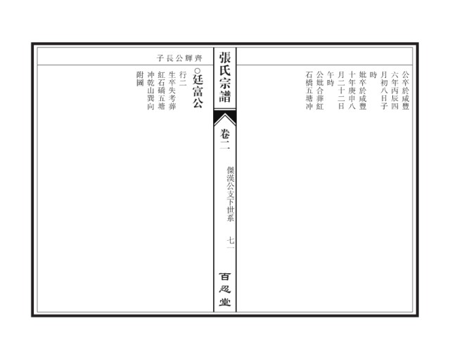 张氏宗谱 子長公輝齊 附圖 冲乾山巽向 紅石礄五塘 生卒失考葬 行二 廷富公 石橋五塘冲 公妣合葬紅 午時 月二十二日 十年庚申八 妣卒於咸豐 時 月初八日子 六年丙辰四 公卒於咸豐 卷二 傑漢公支下世系 七一 百忍堂
