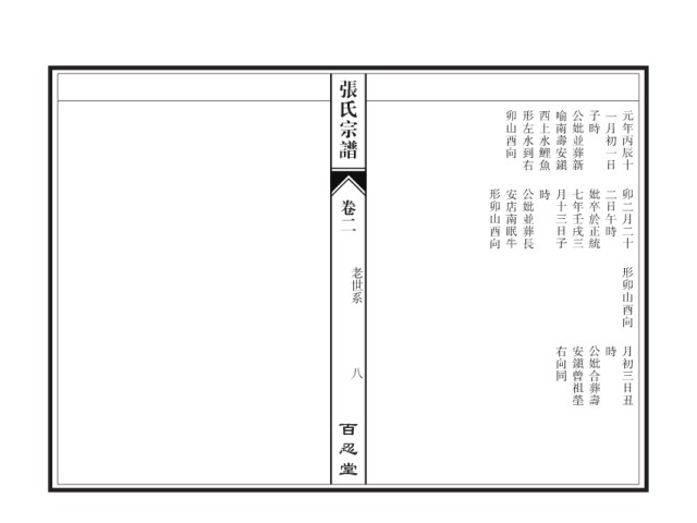 张氏宗谱 卯山酉向 形左水到右 西上水鯉魚 喻南壽安鎭 公妣並葬新 子時 一月初一日 元年丙辰十 形卯山酉向 安店南眠牛 公妣並葬長 時 月十三日子 七年壬戌三 妣卒於正統 二日午時 卯二月二十 卷二 老世系 形卯山酉向 右向同 安鎭曾祖塋 公妣合葬壽 時 月初三日丑 八 百忍堂