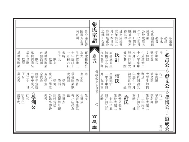 葬失考 子时 月二十一日 二年庚戌八 妣卒于宣统 涂英秀 適太學生 生女一學壹 武爲嗣 承祧胞弟獻 生子四 時 月十九日酉 一年壬申四 生於同治十 傅氏 初三日卯時 年庚午二月 生於同治九 縣丞 太學生加捐 號又新 字洪澤 行一 獻文公
