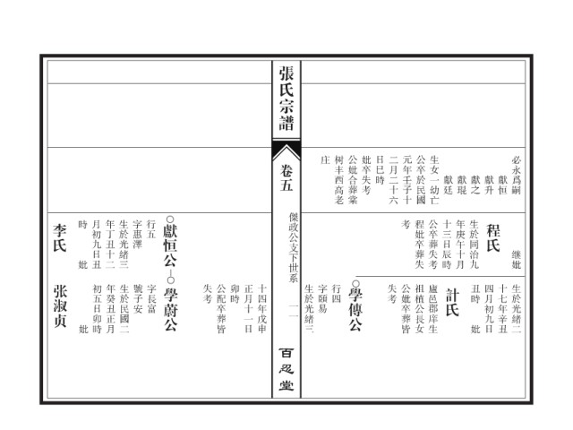 李氏 時 月初九日丑 年丁丑十二 生於光緒三 字惠澤 行五 獻恒公 考 程妣卒葬失 公卒葬失考 十三日辰時 年庚午十月 生於同治九 程氏