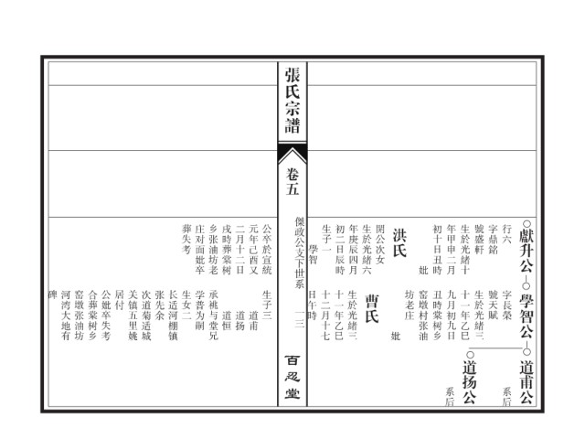 碑 河湾大地有 窑墩张油坊 合葬棠树乡 公妣卒失考 居付 关镇五里姚 次道菊适城 张先余 长适河棚镇 生女二 学普为嗣 承祧与堂兄 生子三 日午時 十二月十七 十一年乙巳 生於光緒三 曹氏 坊老庄 窑墩村张油 丑時棠树乡 九月初九日 十一年乙巳 生於光緒三 號天賦 字長榮 學智公