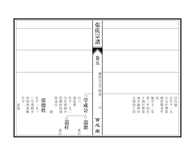 张氏宗谱 卷五 傑政公支下世系 生子二 沙岗孙家畈 二年棠树乡 生于一九三 张德胜 坊老庄 窑墩村张油 九年棠树乡 生于一九二 读私塾 行三 学成公 大深沟上沿 树乡路西村 十四日葬棠 零二年四月 妣卒于二零 洼 树窑墩老牛 五九年葬棠 公卒于一九 汪昌银 道恕 一六 妣 百忍堂 道柱 道恕 系后 系后