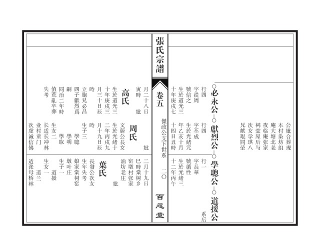 失考 值荒亂卒葬 同治二年時 嗣 四子獻烈爲 立胞兄必昌 時 月三十日辰 十年庚戌三 生於道光三 高氏 寅時 月二十八日 十年庚戌七 生於道光三 號信之 字從周 行四 必永公