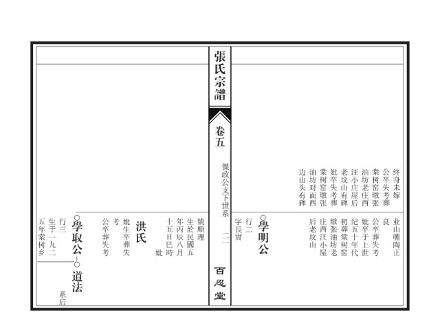 张氏宗谱 卷五 傑政公支下世系 边山头有碑 油坊对面西 棠树窑墩张 妣卒失考葬 老坟山有碑 汪小庄屋后 油坊老庄西 棠树窑墩张 公卒失考葬 终身未嫁 五年棠树乡 生于一九二 行三 學取公 公卒葬失考 考 妣生卒葬失 洪氏 十五日巳時 年丙辰八月 生於民國五 號順理 字長實 行二 學明公 后老坟山 庄西汪小屋 墩张油坊老 初葬棠树窑 纪五十年代 妣卒于上世 公卒葬失考 良 业山嘴陶正 二一 妣 百忍堂 道法 系后