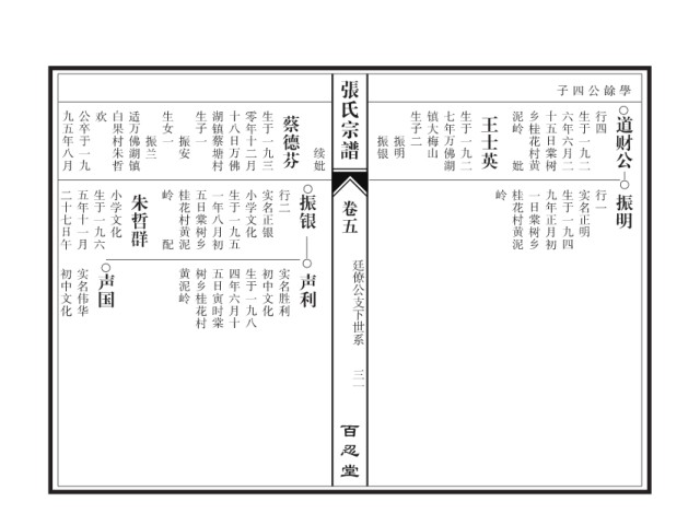 九五年八月 公卒于一九 欢 白果村朱哲 适万佛湖镇 生女一 生子一 湖镇蔡塘村 十八日万佛 零年十二月 生于一九三 蔡德芬 生子二 镇大梅山 七年万佛湖 生于一九二 王士英 泥岭 乡桂花村黄 十五日棠树 六年六月二 生于一九二 行四 道财公
