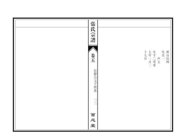 张氏宗谱 十七日 七年一月二 生于二零零 生女一 坝自治州 卷五 声玉 廷僚公支下世系 三三 百忍堂