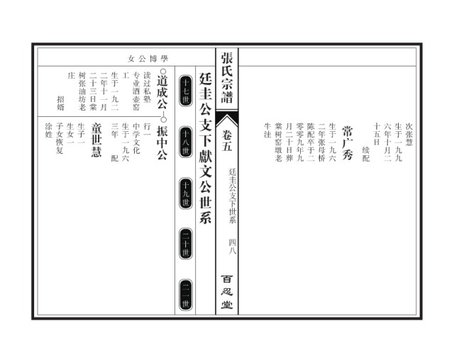 张氏宗谱 女公博學 庄 树张油坊老 二十三日棠 二年十一月 生于一九二 工 专业酒壶窑 读过私塾 道成公 廷圭公支下獻文公世系 十七世 招婿 涂姓 子女恢复 生女一 生子一 童世慧 三年 生于一九六 中学文化 行一 振中公 牛洼 棠树窑墩老 月二十日葬 零零九年九 陈配卒于二 二年张母桥 生于一九六 常广秀 十五日 六年十月二 生于一九九 次张慧 十八世 卷五 续配 配 廷圭公支下世系 十九世 二十世 四八 百忍堂 二一世
