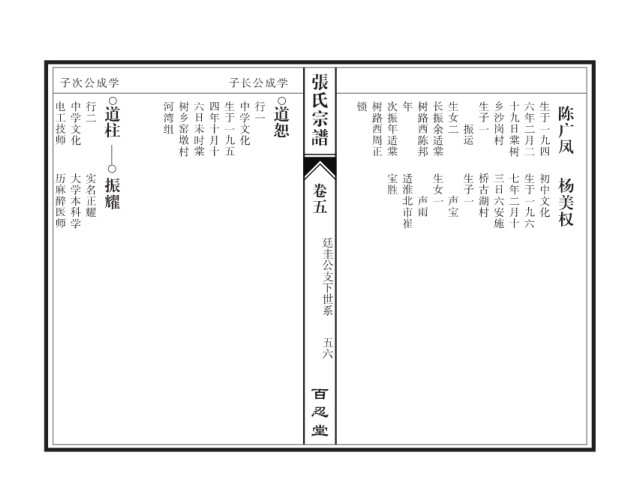 张氏宗谱 子次公成学 子长公成学 电工技师 中学文化 行二 道柱 河湾组 树乡窑墩村 六日未时棠 四年十月十 生于一九五 中学文化 行一 道恕 锁 树路西周正 次振年适棠 年 树路西陈邦 长振余适棠 生女二 生子一 乡沙岗村 十九日棠树 六年二月二 生于一九四 陈广凤 振运 历麻醉医师 大学本科学 实名正耀 振耀 宝胜 适淮北市崔 生女一 生子一 桥古湖村 三日六安施 七年二月十 生于一九六 初中文化 杨美权 卷五 声雨 声宝 廷圭公支下世系 五六 百忍堂