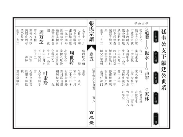 生于一九三 荣公长女 岗周庄周章 棠树八里沙 高小文化 周万芝 组 路西村联合 渠迁棠树乡 因修杭北干 一九六四年 张油坊老庄 树乡窑墩村 七日申时棠 七年十二月 生于一九三 果 城因手续无 回乡后想返 从合肥私自 能分到田地 业土改时为 市政公司就 随父去合肥 初中文化 道炎 廷圭公支下獻廷公世系