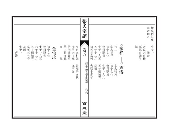 张氏宗谱 南边地穴 树路西洪庄 生子一 花园 草革三竹寺 五日桐城青 六年十二月 生于一九五 公司职员 初中文化 金宝珍 园 革三竹寺花 居桐城青草 油坊老庄现 乡窑墩村张 初五日棠树 五年十二月 生于一九五 公司职员 初中文化 实名正祥 行二 振祥 如 源都市张学 适嘉兴市佳 生女一 卷五 声涛 张云 配 廷圭公支下世系 况不详 婚配子女状 失联十多年 草塥 五年桐城青 生于一九八 公司职员 初中文化 实名张涛 声涛 六六 百忍堂