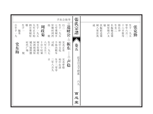 张氏宗谱 子次公取学 公卒于一九 生子一 墩 四日棠树窑 九年正月初 生于一九五 周歧菊 组 窑墩村河湾 七年棠树乡 生于一九五 行二 道财公 成 树八里汪茂 次振彩适棠 银 树窑墩卢义 长振敏适棠 生女二 桥长冲 十六日张母 零年六月二 生于一九五 张克勤 振东 妣 史东梅 时代广场 城关镇鼓楼 河湾组现居 树乡窑墩村 十日午时棠 八年五月三 生于一九七 司机 个体出租车 初中文化 实名正东 振东 卷五 配 廷圭公支下世系 日 二年八月九 生于二零零 初中在读 实名申稳 声稳 六九 百忍堂