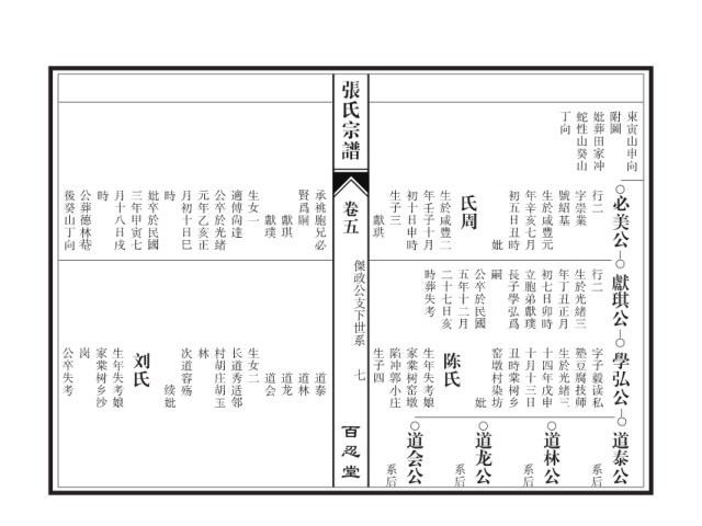 後癸山丁向 公葬德林 時 月十八日戌 三年甲寅七 妣卒於民國 時 月初十日巳 元年乙亥正 公卒於光緒 適傅尙達 生女一 賢爲嗣 承祧胞兄必 生子三 初十日申時 年壬子十月 生於咸豐二 氏周 初五日丑時 年辛亥七月 生於咸豐元 號紹基 字崇業 行二 必美公