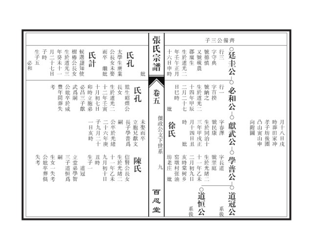生子五 子時 月二十七日 年癸未十一 生於道光三 樹椿公長女 候選 氏計 而卒 公長女未娶 太學生廣業 氏孔 十六日申時 年壬午正月 生於道光二 郡廩生 又號硯農 號德慎 字守典 行三 廷圭公