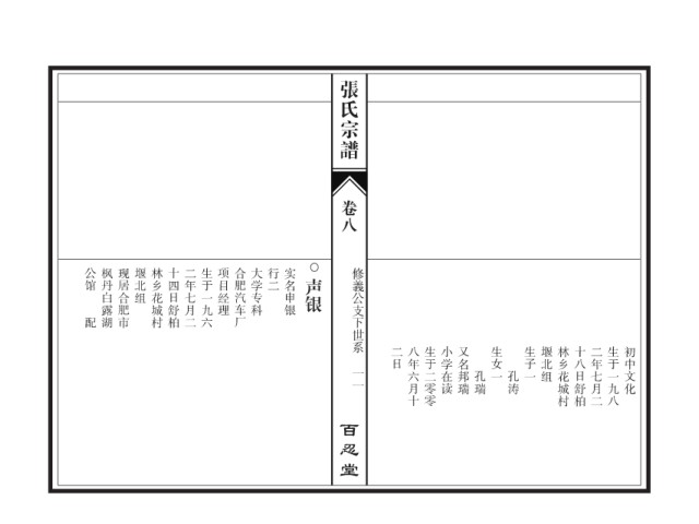张氏宗谱 卷八 公馆 枫丹白露湖 现居合肥市 堰北组 林乡花城村 十四日舒柏 二年七月二 生于一九六 项目经理 合肥汽车厂 大学专科 行二 实名申银 修義公支下世系 声银 配 二日 八年六月十 生于二零零 小学在读 又名邦瑞 生女一 生子一 堰北组 林乡花城村 十八日舒柏 二年七月二 生于一九八 初中文化 一一 孔瑞 孔涛 百忍堂