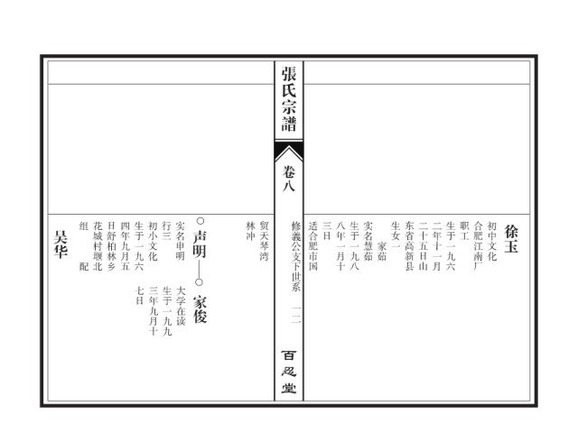 张氏宗谱 卷八 组 花城村堰北 日舒柏林乡 四年九月五 生于一九六 初小文化 行三 实名申明 林冲 贸天琴湾 修義公支下世系 适合肥市国 三日 八年一月十 生于一九八 实名慧茹 生女一 东省高新县 二十五日山 二年十一月 生于一九六 职工 合肥江南厂 初中文化 徐玉 吴华 声明 家茹 配 七日 三年九月十 生于一九九 大学在读 家俊 一二 百忍堂