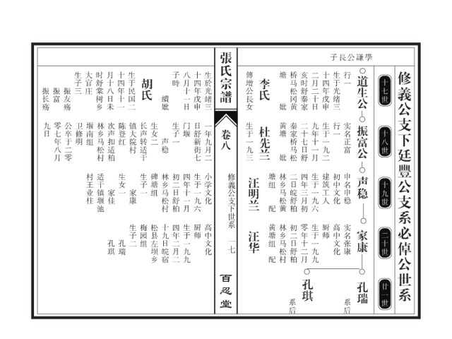 生子三 大官庄 时舒棠树乡 月十八日未 十四年十一 生于民国二 子時 八月十一日 十四年戊申 生於光緒三 傳增公長女 塘 桥马松冈黄 亥时舒秦家 二月二十日 十四年戊申 生于光绪三 行一 修義公支下廷豐公支系必倬公世系