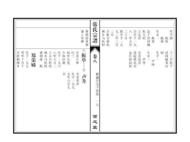 张氏宗谱 埂上有碑 黄塘组黄塘 林乡马松村 公妣合葬柏 二日 九二年二月 妣卒于一九 二十日 八一年五月 公卒于一九 王先存 松元村 适干汊河镇 生女一 生子四 振悟 振青 振举 日舒柏林乡 零年十月十 生于一九七 郑荣娣 黄塘组 林乡马松村 十五日舒柏 六年八月二 生于一九六 个体经商 初中文化 行三 实名正举 振举 卷八 金庄徐向阳 适皖淮北市 实名张芳 生女一 生子一 村 汊河镇龙山 十二日舒干 声芳 声涛 配 日 五年六月九 生于一九九 实名东升 声升 修義公支下世系 一九 百忍堂