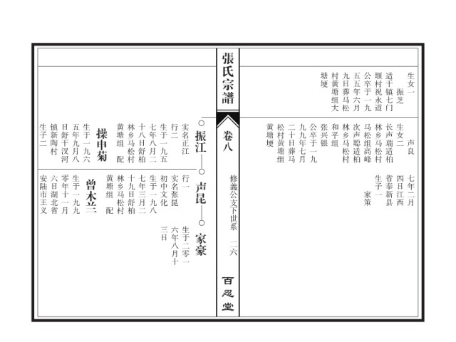 生子二 镇新陶村 日舒干汊河 五年九月八 生于一九六 操申菊 黄塘组 林乡马松村 十八日舒柏 七年八月二 生于一九五 行二 实名正江 振江 卷八 黄塘埂 松村黄塘组 二十日葬马 九九年七月 公卒于一九 张兴银 和平组 林乡马松村 次声聪适柏 马松组高峰 林乡马松村 长声瑞适柏 生女二