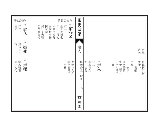 张氏宗谱 子次公宽学 子长公宽学 棉匠 行三 公卒葬失考 抓壮丁失联 冈黄塘 秦家桥马松 六日巳时舒 年十一月初 生于民国七 行一 道仓 道存公 行一 实名正林 振林 卷八 声久 声昆 高中文化 实名张理 十八日 零年五月二 生于一九九 修義公支下世系 初中文化 实名张久 行二 十日 三年六月二 生于二零一 实名静怡 生女一 生子一 贞镇铜门村 声理 声久 家怡 家豪 二七 百忍堂