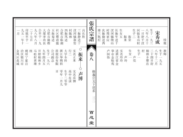 一月 九五一年十 付妣卒于一 二十七日 九八年八月 公卒于一九 大厦李尚良 合肥市锦程 五振菊适 社区蔡道能 合肥市临湖 四振凤适 村陈林 汊河镇新窑 三振静适干 吕长胜 塘三 次振勤适西 村周家应 汊河镇绕山 长振年适干 生女五 生子二 河镇龙山村 一日舒干汊 八年八月十 生于一九三 宋秀成