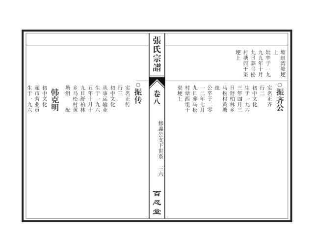 张氏宗谱 埂上 村塘西干渠 九日葬马松 九九年十月 妣卒于一九 上 塘组湾塘埂 生于一九六 超市营业员 初中文化 韩克明 塘组 乡马松村黄 九日舒柏林 五年十月十 生于一九六 从事运输业 初中文化 行三 实名正传 振传 卷八 渠埂上 村塘西组干 九日葬马松 一二年七月 公卒于二零 组 马松村黄塘 日舒柏林乡 三年四月三 生于一九六 初中文化 行二 实名正齐 振齐公 配 修義公支下世系 三六 百忍堂