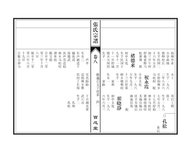 公妣合葬马 十九日 零六年八月 妣卒于二零 八日 零三年十月 公卒于二零 陈玉稳 塘东组 林乡马松村 次声芬适柏 徐能武 镇街道 长声娟适干 生女二 生子一 晓天大河沿 十一日舒城 九年十一月 生于民国十 初中文化 褚德来 松黄塘 舒秦家桥马 初三日午时 十六年五月 生于民国二 教师校长 小学高级 初师毕业