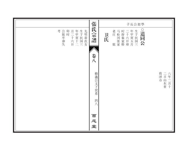 张氏宗谱 子長公恕學 考 公妣卒葬失 卯时 月二十六日 年甲寅十二 生于民国三 先明翁次女 老庄 马松冈张家 时舒秦家桥 二十六日卯 年甲寅五月 生于民国三 卫氏 道同公 妣 卷八 修義公支下世系 荷泽市 二日山东省 六年二月十 四八 百忍堂