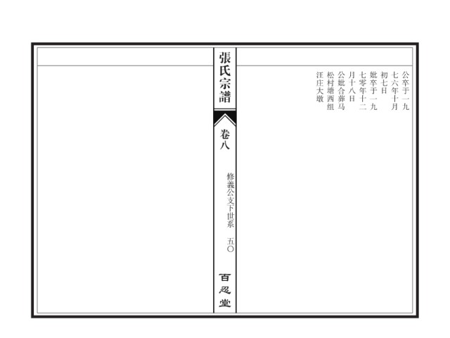 张氏宗谱 汪庄大墩 松村塘西组 公妣合葬马 月十八日 七零年十二 妣卒于一九 初七日 七六年十月 公卒于一九 卷八 修義公支下世系 五〇 百忍堂