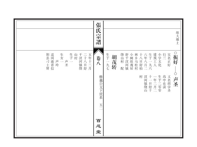 张氏宗谱 组大墩上 阳县刁士贤 适河南省信 生女一 生子一 山村 干汊河镇绕 二十八日舒 五年十二月 生于一九七 胡茂转 绕山村 舒干汊河镇 小闸组现居 林乡马松村 十八日舒柏 六年八月二 生于一九六 建筑工人 小学文化 行三 实名正好 振好 卷八 声玲 声圣 配 修義公支下世系 村 汊河镇绕山 十一日舒干 一年二月二 生于二零零 高中在读 又名胡学圣 声圣 五二 百忍堂