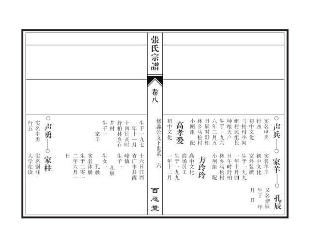 行五 实名申勇 声勇 生子一 井村 舒柏林乡石 十四日亥时 一年十一月 生于一九七 修義公支下世系 初中文化 高孝爱 小闸组 林乡马松村 日辰时舒柏 六年二月五 生于一九六 种粮大户 组村民组长 马松村小闸 初中文化 行四 实名申兵 声兵