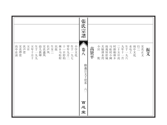 张氏宗谱 高中在读 实名烨萱 次声萱 五日 五年十月十 生于一九九 幼儿教师 实名鑫凤 长声凤 生女二 民组 林乡马松村 十一日舒柏 零年九月二 生于一九七 小学文化 高贤平 小区 关镇清水湾 组现居舒城 马松村小闸 时舒柏林乡 二十五日戊 九年十一月 生于一九六 水电工 初中文化 行二 实名正义 卷八 振义 配 修義公支下世系 六一 百忍堂