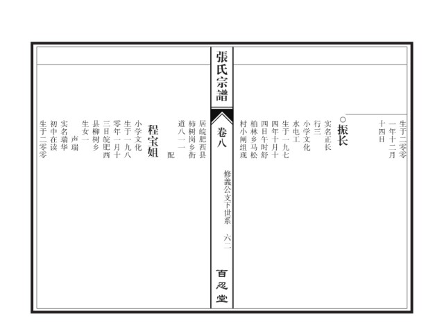 张氏宗谱 生于二零零 初中在读 实名瑞华 生女一 县柳树乡 三日皖肥西 零年一月十 生于一九八 小学文化 程宝姐 道八一一 柿树岗乡街 居皖肥西县 卷八 村小闸组现 柏林乡马松 四日午时舒 四年十月十 生于一九七 水电工 小学文化 行三 实名正长 振长 十四日 一年十二月 生于二零零 声瑞 配 修義公支下世系 六二 百忍堂