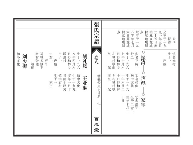 生子一 镇洪宕村 日舒干汊河 零年一月十 生于一九九 初中文化 王业琳 修義公支下世系 南组 乡花城村墩 十日舒柏林 一年六月二 生于一九九 初中文化 实名张彪 声彪