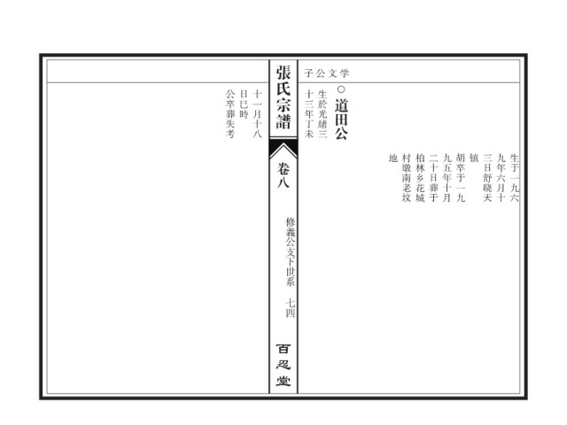 张氏宗谱 子公文学 公卒葬失考 日巳時 十一月十八 十三年丁未 生於光緒三 道田公 地 村墩南老坟 柏林乡花城 二十日葬于 九五年十月 胡卒于一九 镇 三日舒晓天 九年六月十 生于一九六 卷八 修義公支下世系 七四 百忍堂