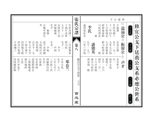 考 公妣卒葬失 生子一 河镇瑜城 亥時舒干汊 七月十一日 十四年戊申 生於光緒三 義洪翁次女 李氏 马松冈西安 時舒秦家桥 十月初四亥 十二年丙午 生於光緒三 字銀傳 道福公 十七世 修宜公支下廷薦公支系必應公世系