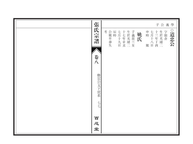 张氏宗谱 子公義學 考 公妣卒葬失 辰時 七月十九日 十七年辛丑 生於光緒二 子義翁三女 姚氏 申時 七月十八日 十三年丁酉 生於光緒二 字銀倉 道忠公 妣 卷八 修宜公支下世系 七七 百忍堂