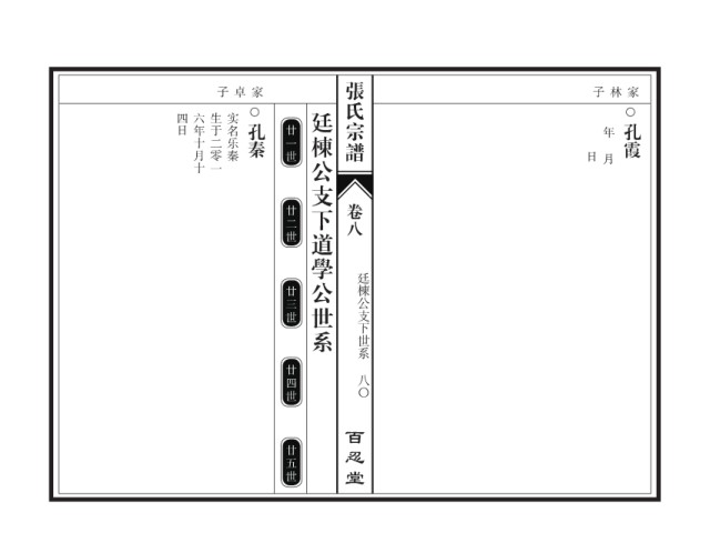 张氏宗谱 子卓家 子林家 四日 六年十月十 生于二零一 实名乐秦 廷棟公支下道學公世系 孔秦 廿一世 日 年 孔霞 月 廿二世 卷八 廷棟公支下世系 廿三世 廿四世 八〇 百忍堂 廿五世